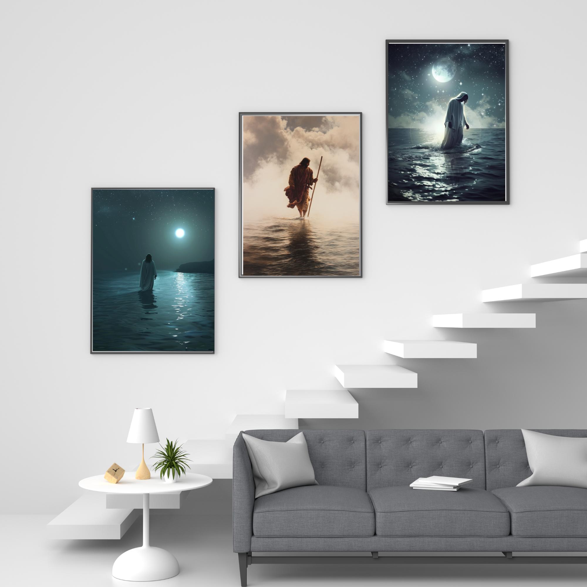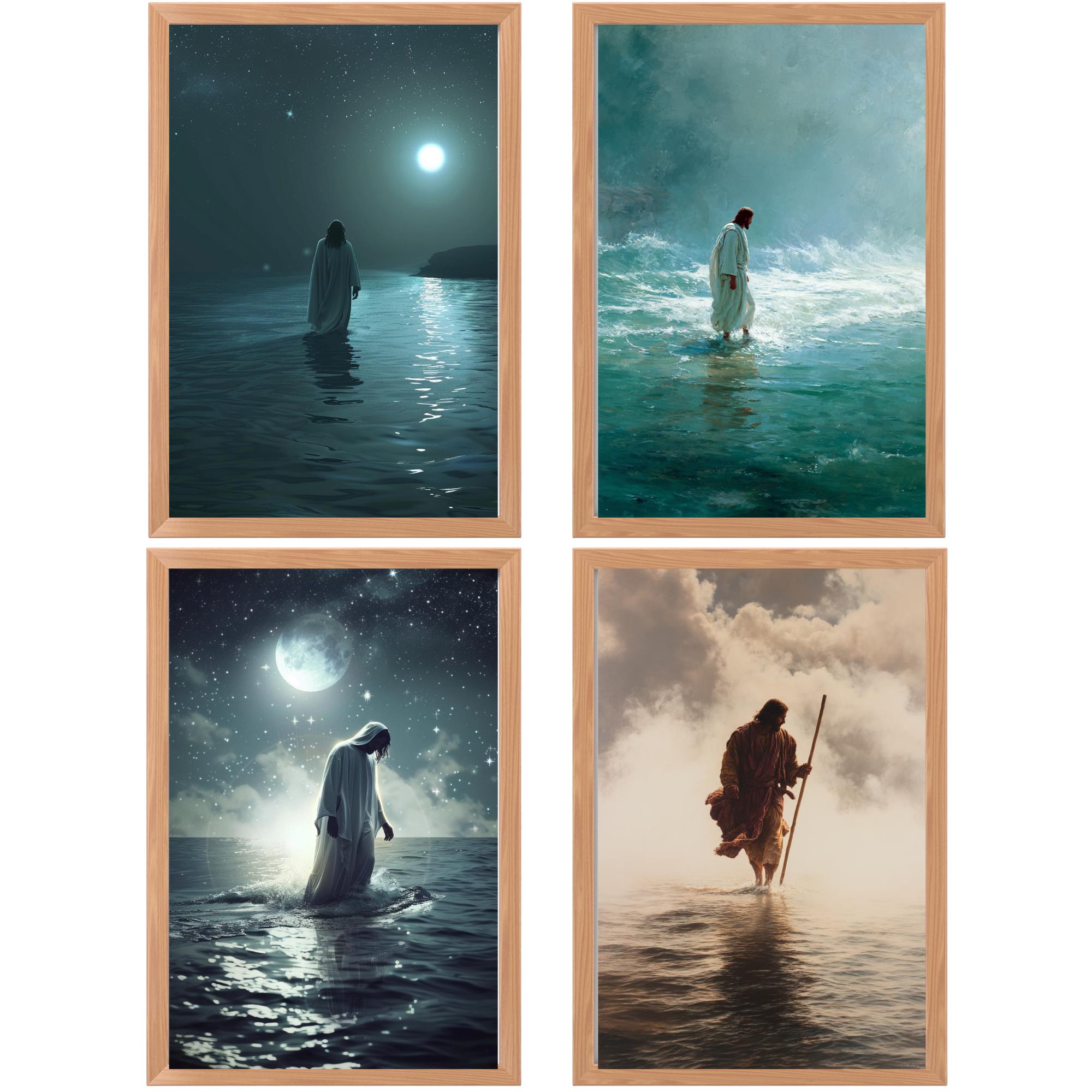 Each piece captures Jesus walking over the waters with heavenly light and dramatic depth — a daily reminder that He is with you in every storm.