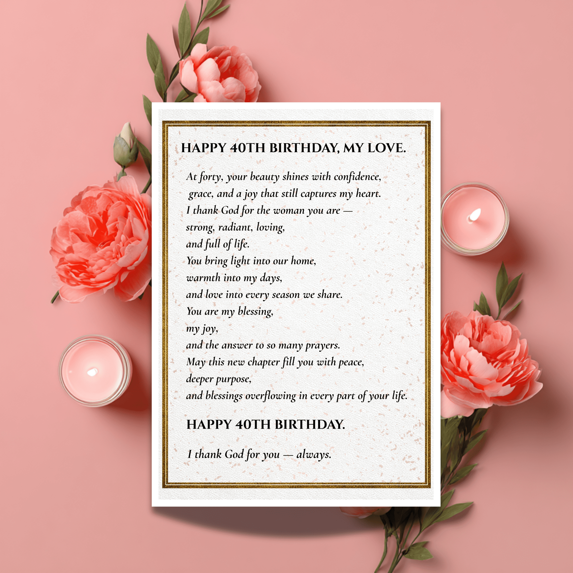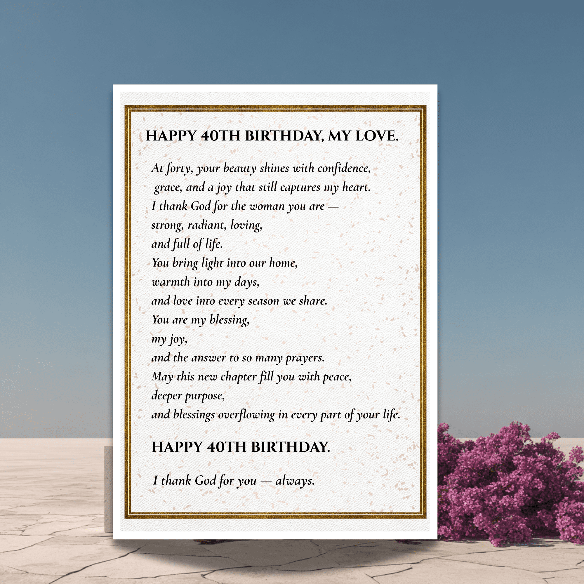 This elegant Wife 40th Birthday Prayer Card features a premium gold frame, soft feminine accents, and a warm message written from a loving husband’s heart.