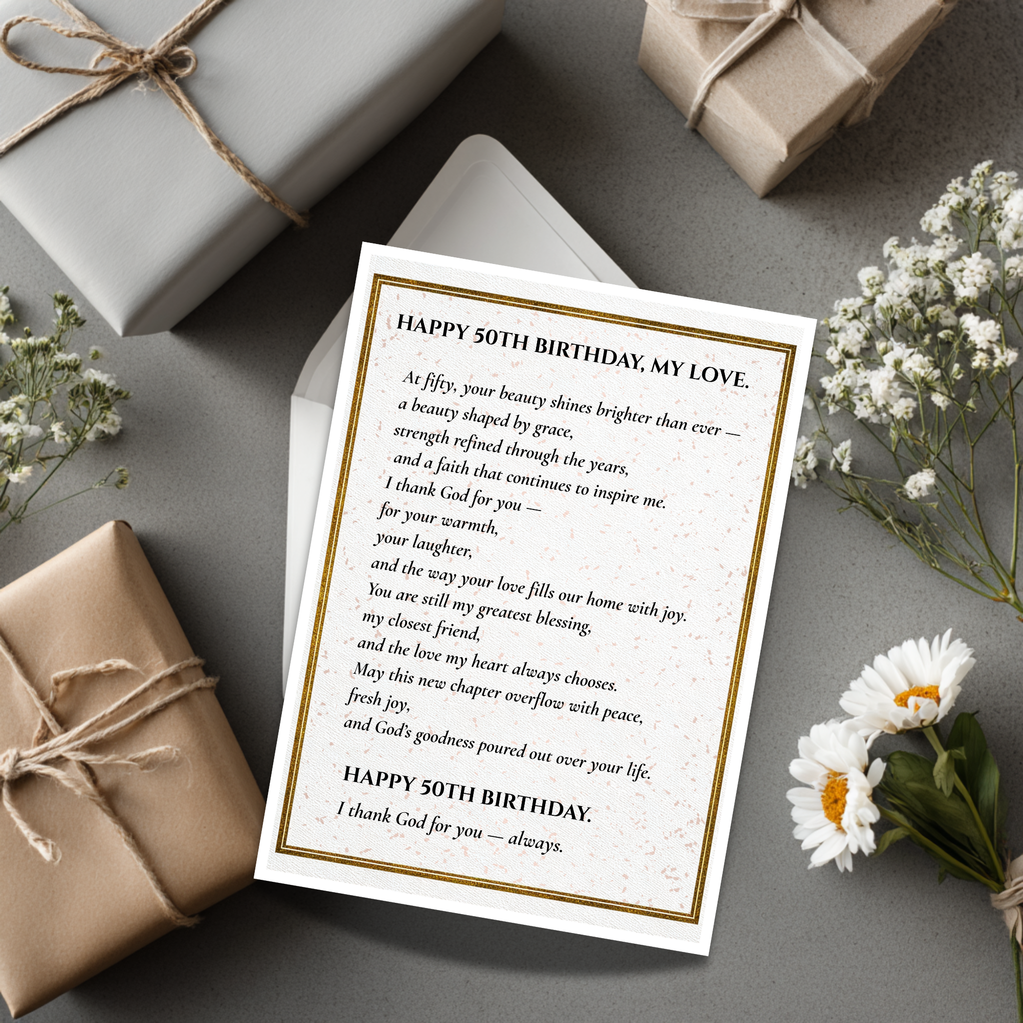 This elegant Wife 50th Birthday Prayer Card features soft gold accents, a premium textured background, and a heartfelt message written from a loving husband’s heart.