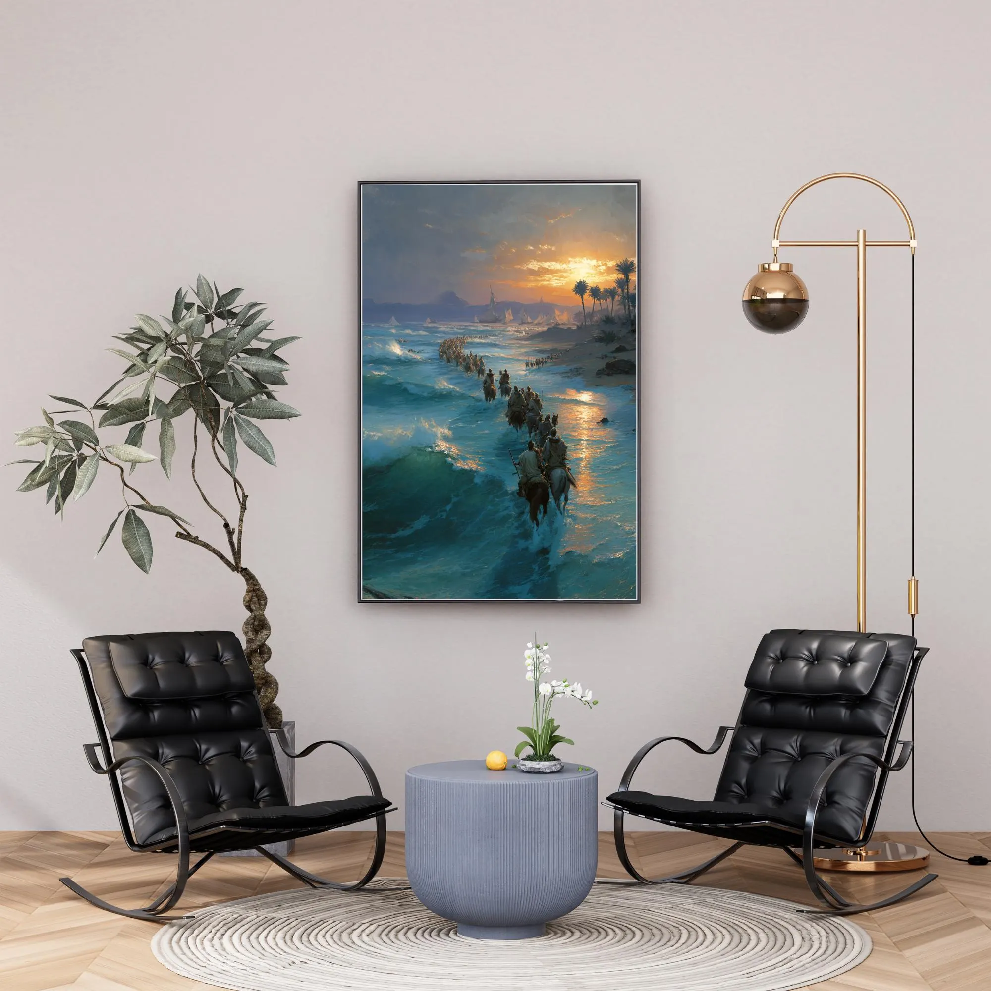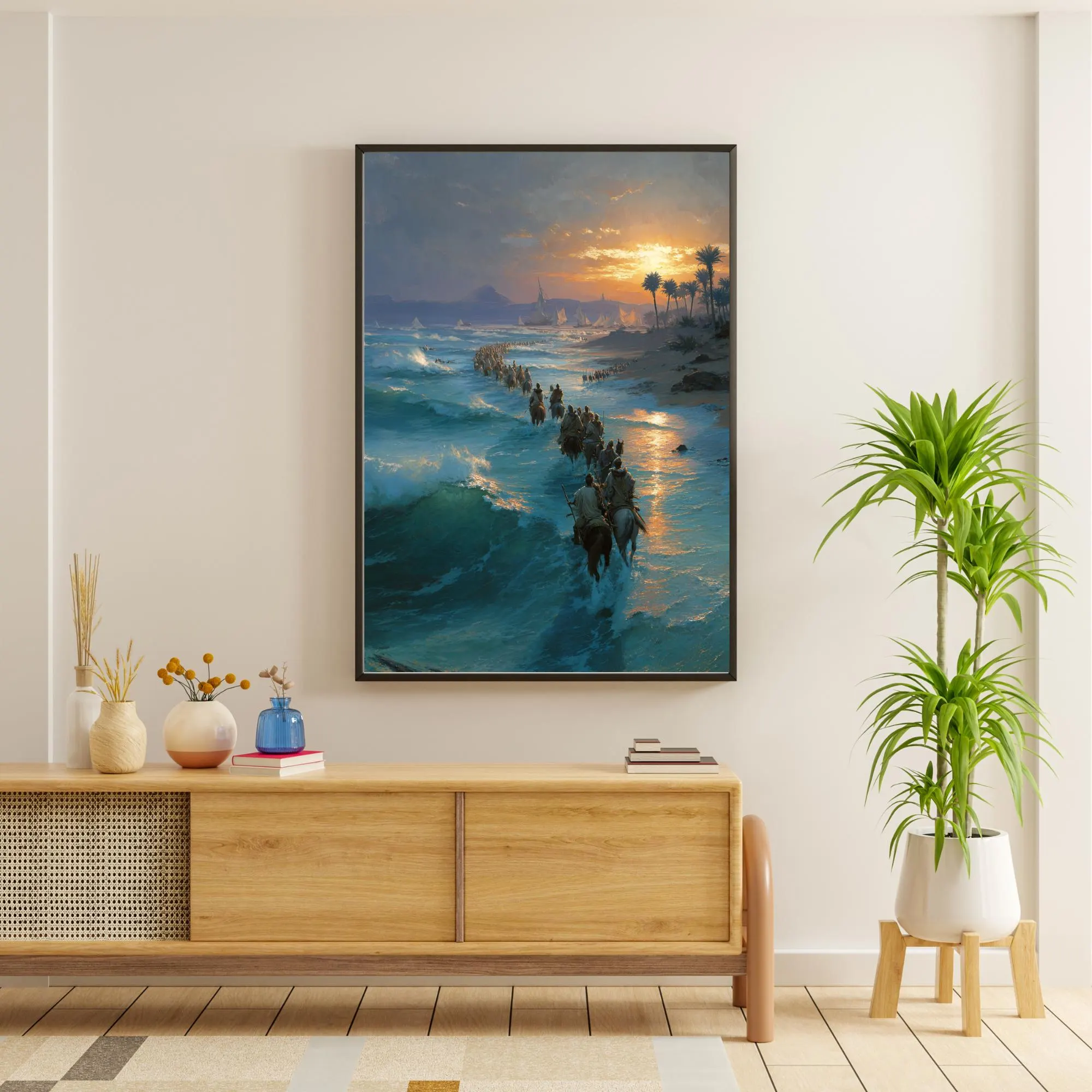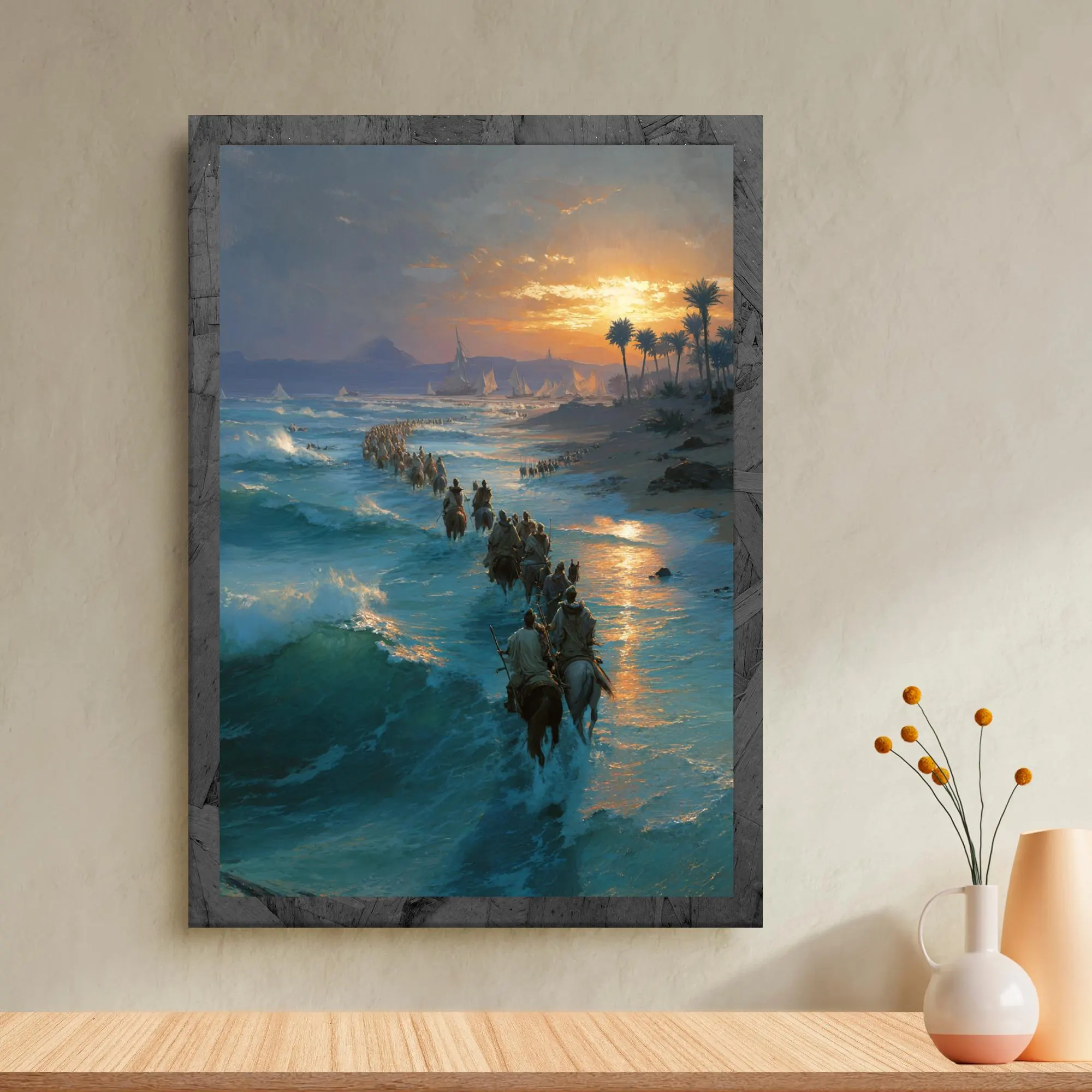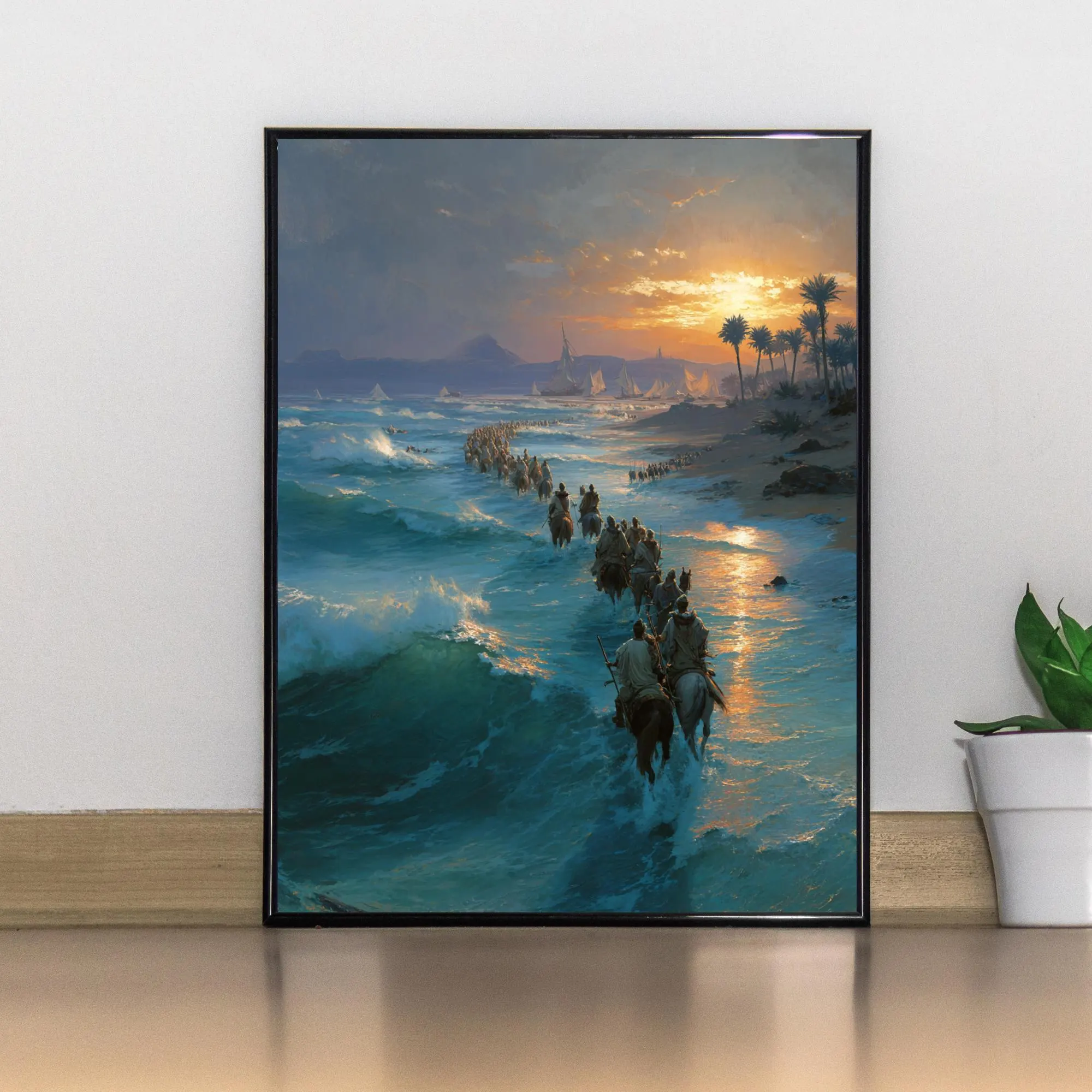 Bring the power of the Exodus into your home with this cinematic Christian wall art depicting the Israelites journeying through the sea, guided by God’s deliverance. Painted with dramatic light, rolling waves, and a pilgrim procession, this piece captures the awe of the Exodus story—a reminder that the God who led His people still makes a way today.