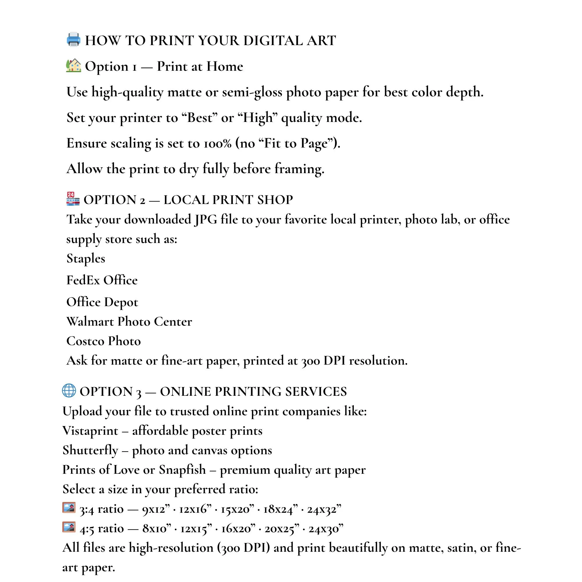 2️⃣ Print at home or through trusted print services (Vistaprint, Shutterfly, or local print shops).