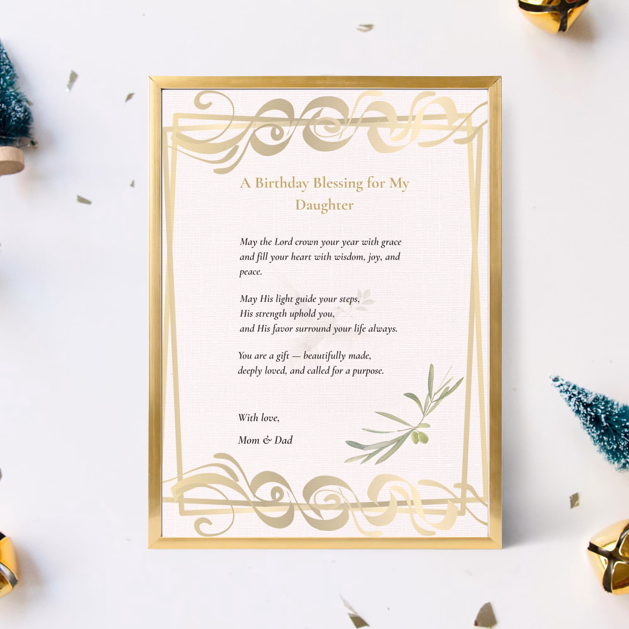 Designed with soft gold detailing, olive accents, and a timeless scripture-inspired style, this blessing is perfect for framing, gifting, or including with a birthday card.