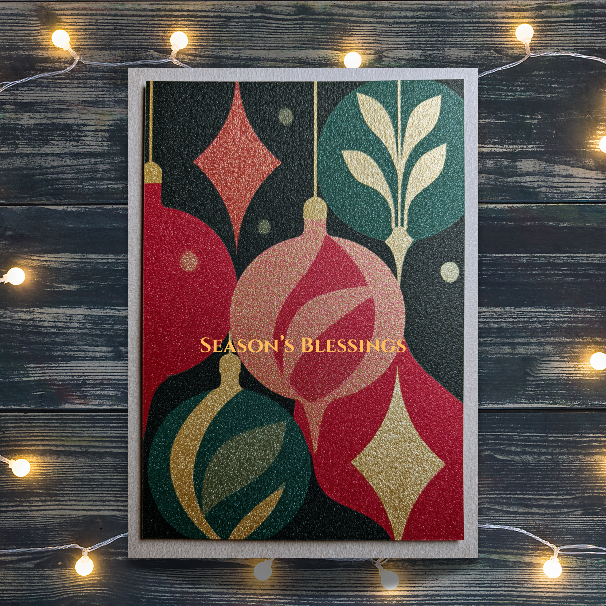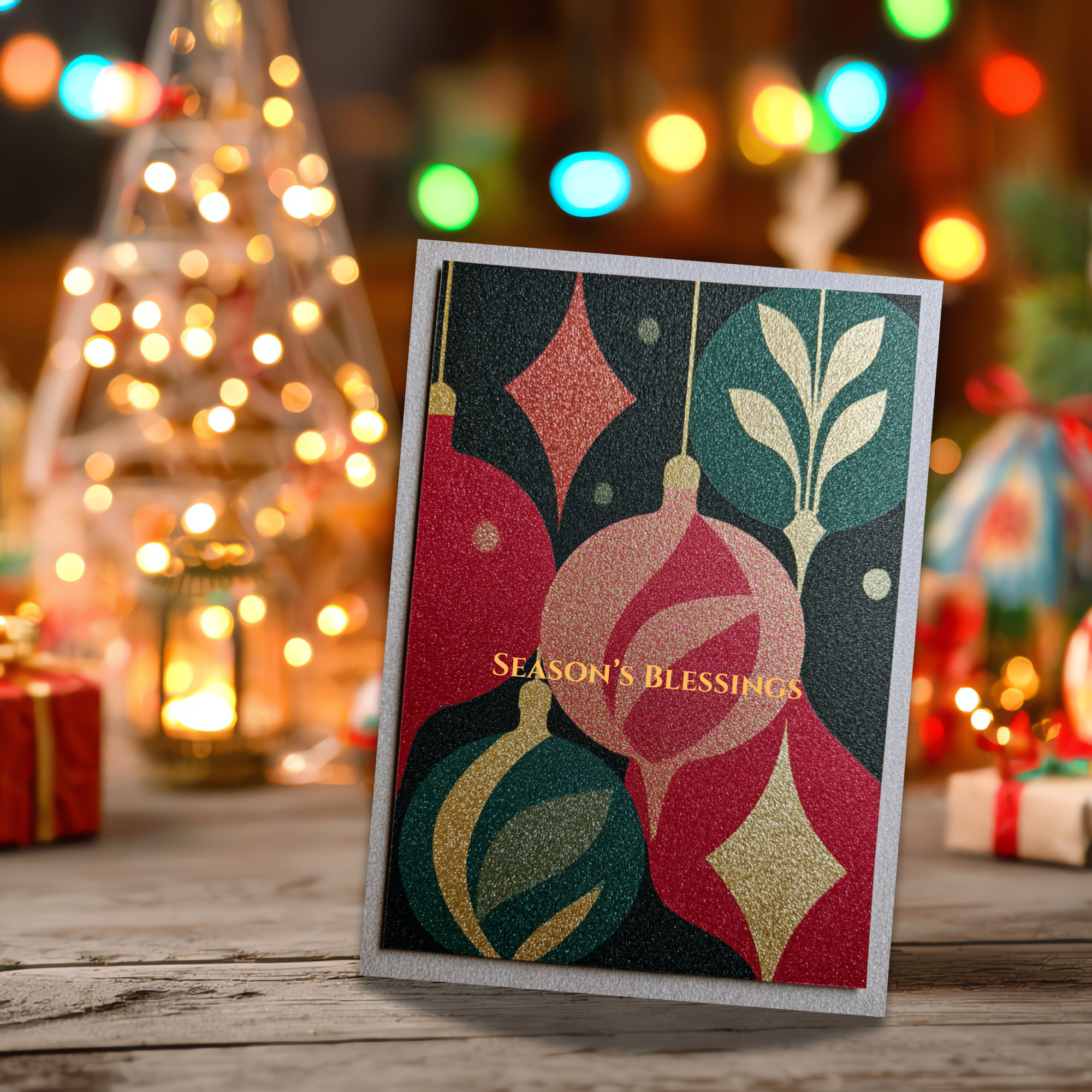 Celebrate the season with this elegant Season’s Blessings Christmas Card, designed in a modern luxe style featuring rich red, green, and gold ornaments with a subtle glitter-texture finish. Perfect for gifting, mailing, or pairing with Christmas presents, this premium greeting card brings warmth and festive charm to every holiday moment.
