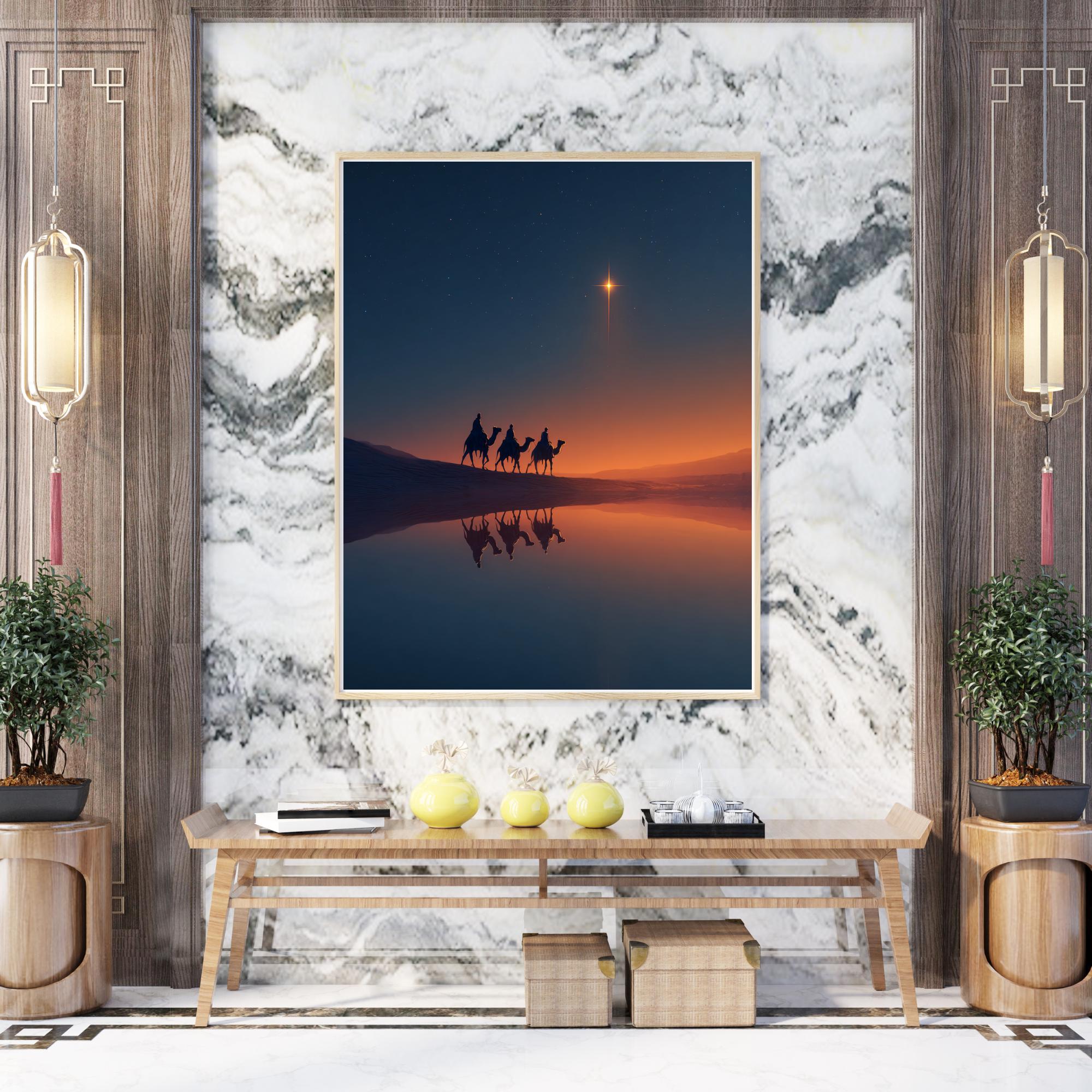 Experience the wonder of the Holy Night with this Star of Bethlehem digital art print — a breathtaking depiction of the Three Wise Men following the divine light that led them to Christ. Rendered in warm twilight tones with reflective stillness, this artwork brings sacred peace to your home this Christmas and beyond.