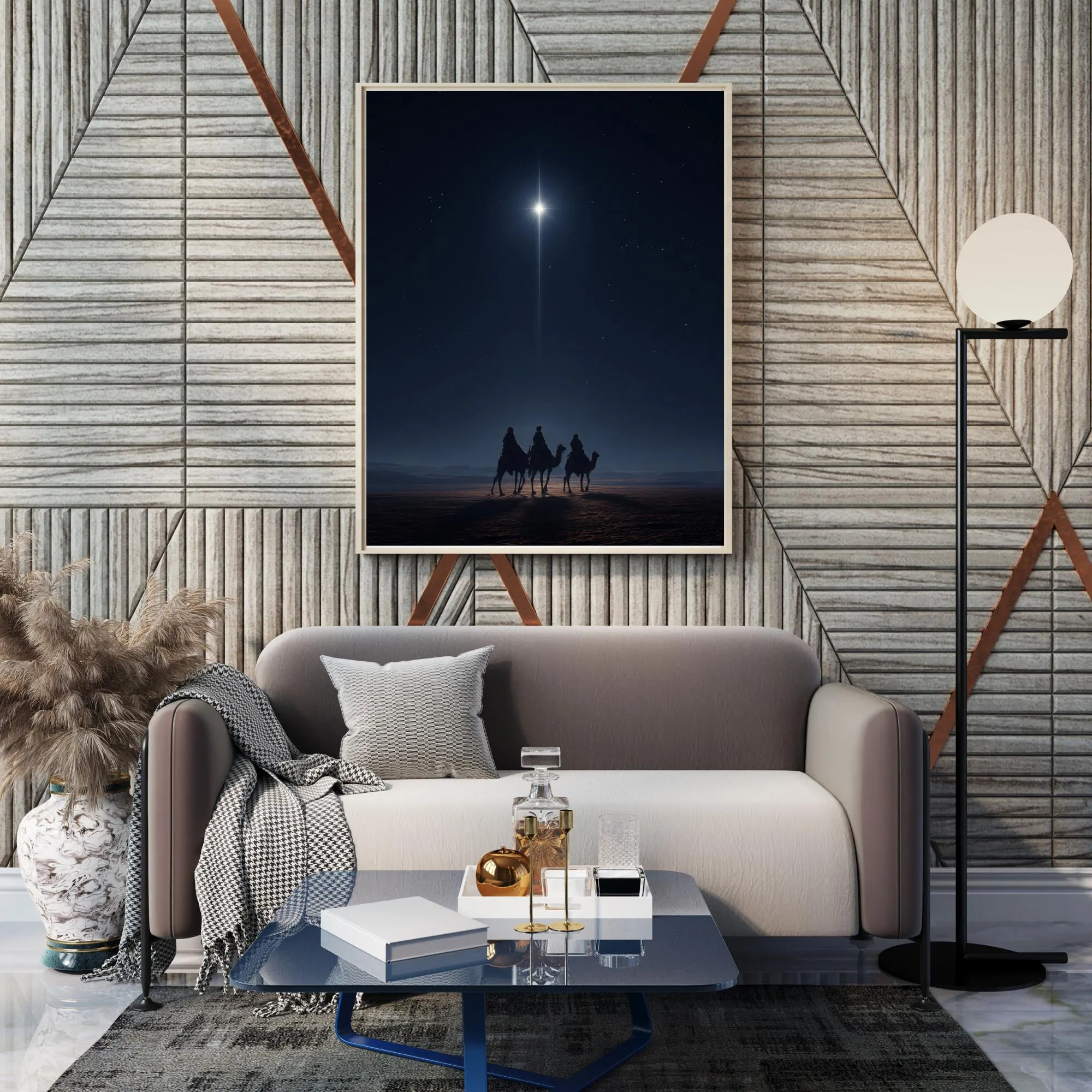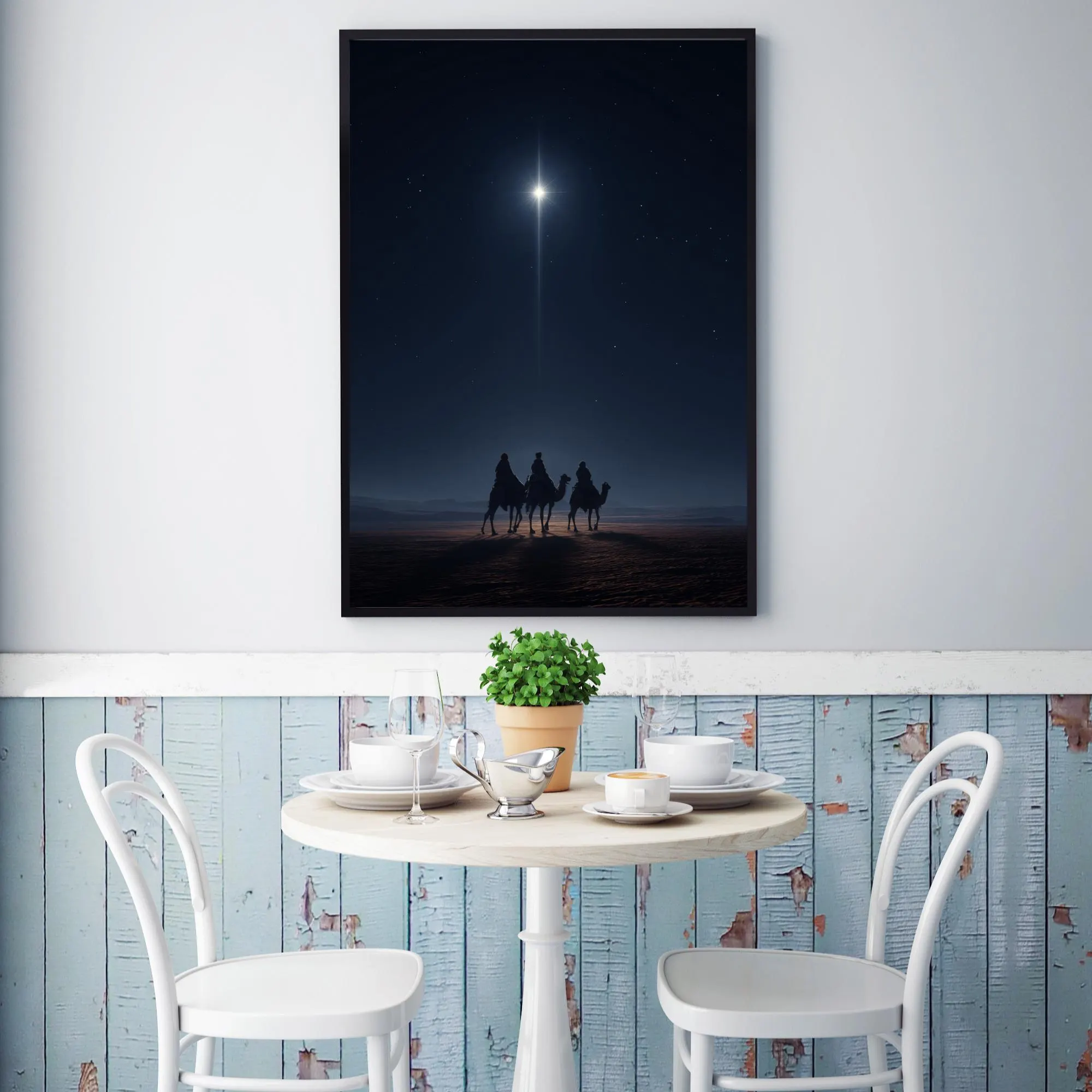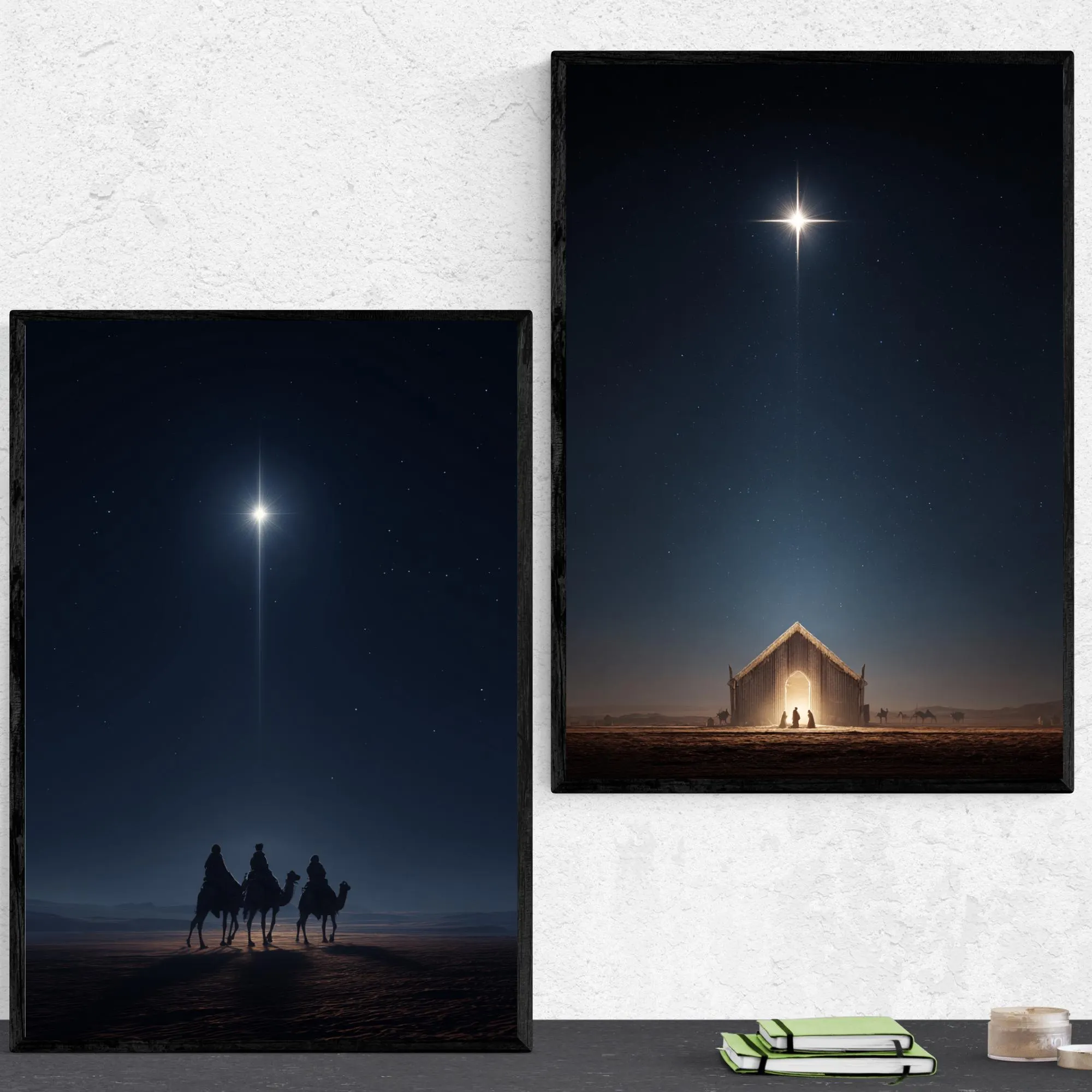 Bring the wonder of the first Christmas night into your home with this Star of Bethlehem wall art printable set, featuring two cinematic designs — the Wise Men following the Star and the Nativity scene beneath its light.